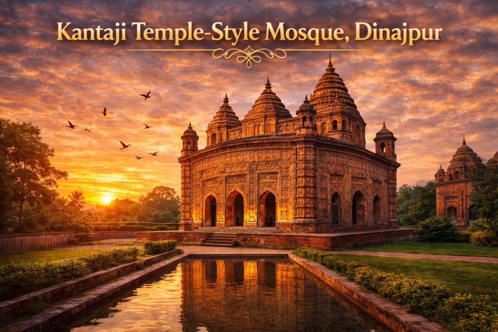 Although its design resembles a traditional Hindu temple, the Kantaji Temple-Style Mosque in Dinajpur represents a remarkable fusion of Islamic and Hindu architectural influences. Built during the 18th century, the structure is widely admired for its elaborate terracotta panels and decorative brickwork, which highlight the artistic excellence of craftsmen from that period. The mosque’s exterior is richly embellished with finely detailed carvings that give it a unique visual identity among the historical mosques in Bangladesh.